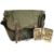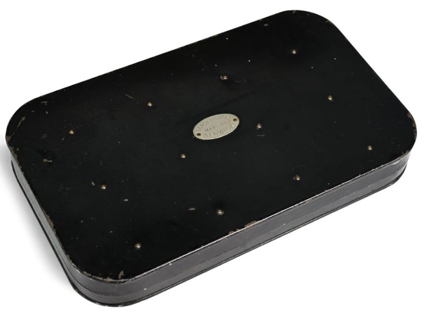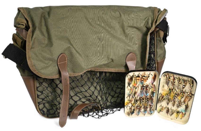Hardy Alnwick black japanned fly tin, 7" x 4" with 40 large clips, 40 fully dressed salmon flies, singles and doubles from size 5 to 1/0. All look unfished. Closes well retaining a good finish. Unnamed canvas and leather shoulder bag 16" x 12" x 6", 2x front pockets, one large inner with waterproof liner, back zip pocket, 1 ½" shoulder strap and net front. Looks unused, straps and buckles good. (2)