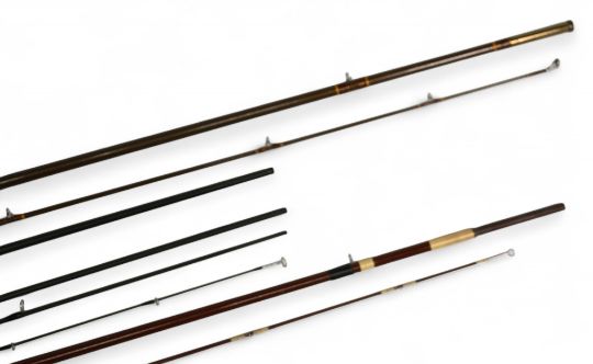 Flextec Spring Creek carbon trout fly rod, 9ft 4pc line 5/6#, alloy double uplocking reel seat and collar, lined stripping rings, zip top Cordura tube, very light use. Milbro Trufly hollow glass trout fly rod 9ft 6" 2pc, alloy down locking reel seat, lined butt/tip rings, cloth bag, signs of use. Winfield (wonder of Woolies!) hollow glass trout fly rod, 9ft 2pc alloy down locking reel seat, no bag. (3)