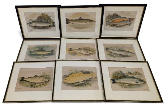 9x Period The Angler Magazine Fishing Prints: The Great Lake Trout, Chub, Loch Killin Charr, Golden Tench, Common Tench, Grilse or Young Salmon. All well framed, 6 in matching frames and 3 in different frames - Bull Trout, Galway Sea Trout, Torgoch Alpine Charr. All under glass - size #23cm x39cm (9)