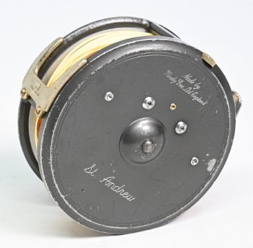 Hardy Bros "The St Andrew" alloy sea rout/salmon fly reel with spare spool, 4 1/8" ventilated spool, 2 screw lath, black handle, milled rim tensioner, constant check, 2 screw alloy line guide and ribbed foot. Light use, runs well