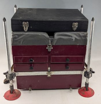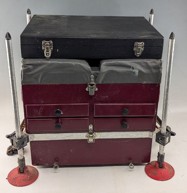 Wooden Fishing Tackle Seat, with a boxed selection of fishing floats