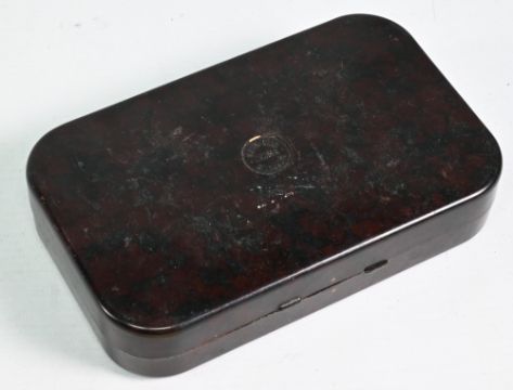 Hardy Neroda oxblood finish deep fly box, chenille bar interior, original hasp/hinge, contains various wet/dry flies