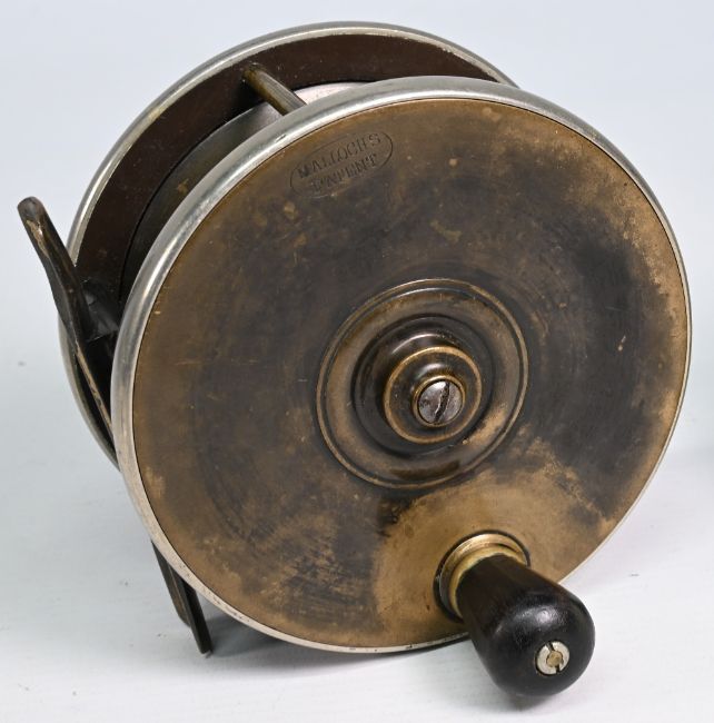 Mallochs brass and ebonite "Sun & Planet" salmon reel 4 ½" wide spool with original faceted tapered handle, German silver nickel rims, ebonite back (with crescent crack), stamped with oval Malloch's patent. Full foot slight bend to one end, very strong constant check. Runs well, sounds superb