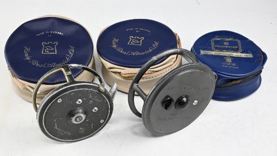 Hardy the Zenith 3 ½" wide spool reel cage only, with repairs for spares, Hardy Viscount 150 cage and 3 x Hardy zip padded reel cases. (5)