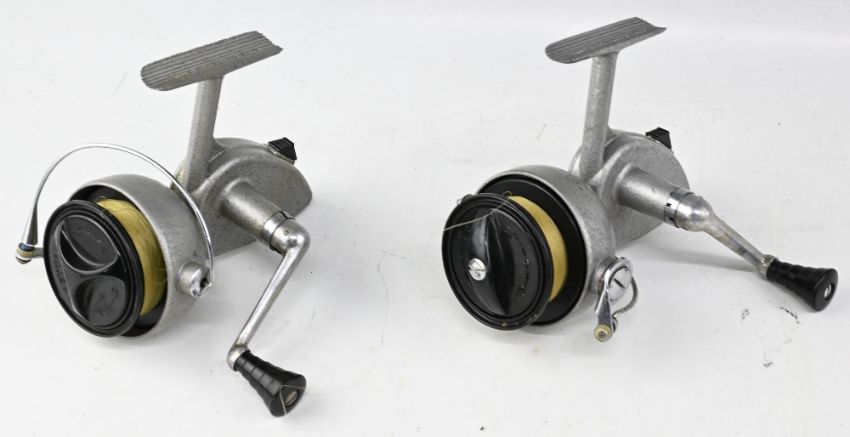 Pair of Bretton of France model 602 spinning reels, one with bail fault, one tight to turn, both with good finish, and spare spools in gilt top tubs