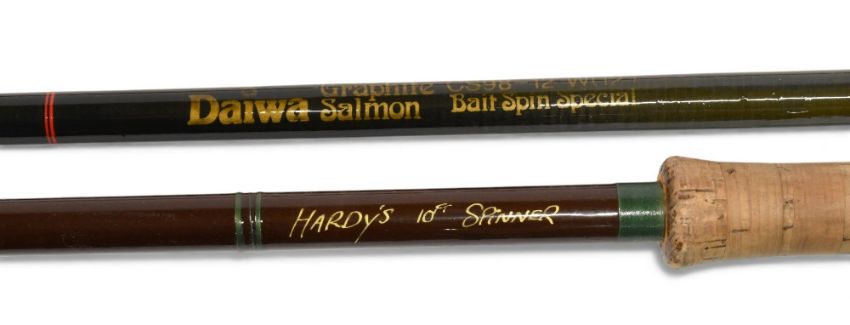 Hollow glass 10ft spinner on Hardy blank, 27" handle, double down locking reel seat, lined rings throughout, Hardy cloth bag. Light use. Daiwa Graphite Bait Spin special salmon rod CS 98-12, 12ft 3pc, 27" handle, uplocking reel seat, lined rings throughout, MCB. Light use. (2)