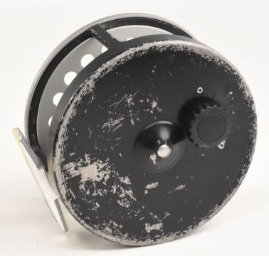 Hardy Bros Marquis Disc 9/10/11 No 436 alloy salmon fly reel with 3 spare spools, 4 1/8" wide ventilated spool, 2 screw latch, black handle, rear tensioner (stiff), constant check. Signs of paint loss to rear. All in cloth pouches (4)