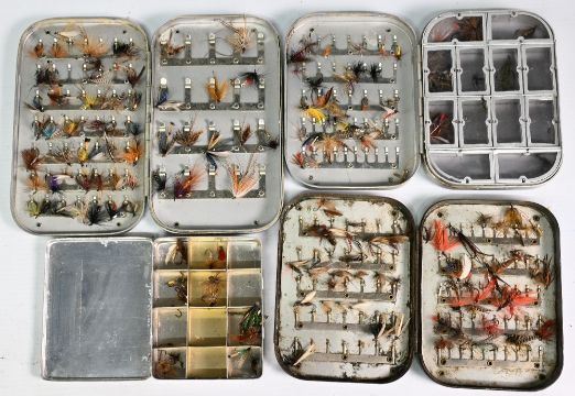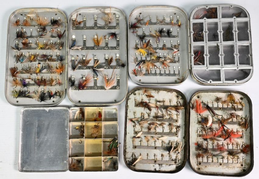Wheatley slim alloy pocket fly box, with trout/salmon size metal clips, holding assorted flies, a dry fly box, 12 compartments with clips to lid and flies, an early Wheatley box, brown painted finish with dry flies, plus 1 other. (4)