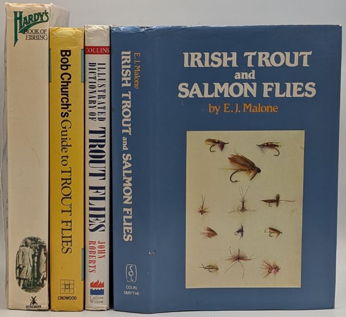 4x Fishing & Fly-Fishing Guidebooks: Hardy Book Of Fishing 1975, Bob Church's Guide To Trout Flies 1989, Irish Trout and Salmon Flies E J Malone 1984, Collins Illustrated Dictionary of Trout Flies John Roberts 1995 - all H/b + D/j