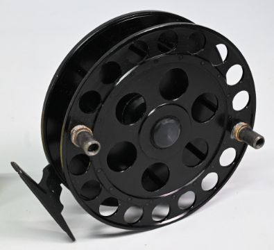 A large unnamed Nottingham style centre pin trotting reel 5 ½" wide caged ventilated spool, twin handles, spring loaded rear tensioner, in zip case. Spins forever