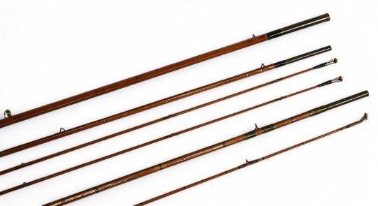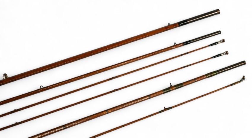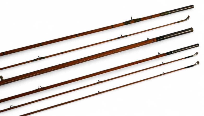 Ogden Smith London split cane trout fly rod 10ft 3pc with spare tip, alloy/brass reel fitting and collar, red agate butt/tip rings, cloth bag, looks very original. A E Rudge Redditch split cane trout fly rod 8ft 6" 2pc, alloy reel fittings, lined tip rings, cloth bag. Good for age. (2)