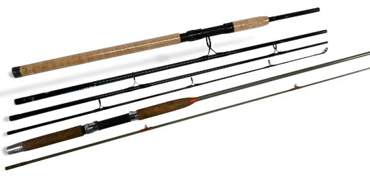 Trog Tempest Ranger composite construction spinning rod, 9ft 4pc, action 1-3oz, 24" handle, uplocking reel seat, lined rings throughout, MCB. Looks unused, plastic still on handle. Unnamed solid glass spinning rod 7ft 2pc, 15" handle, alloy uplocking reel seat, cloth bag. (2)