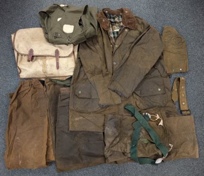 Vintage Barbour Wax Jacket Trousers with a loose hood and belt, a Barbour Solway zipper 50" chest (damage to a couple of press studs noted) A82 trousers L, Barbour A82 braced trousers M, Stephen's wax elastic trousers L, Sue Burgess waistcoat (holes to pockets). All with in a Efgeeco canvas fishing bag - with age related wear - some TLC needed