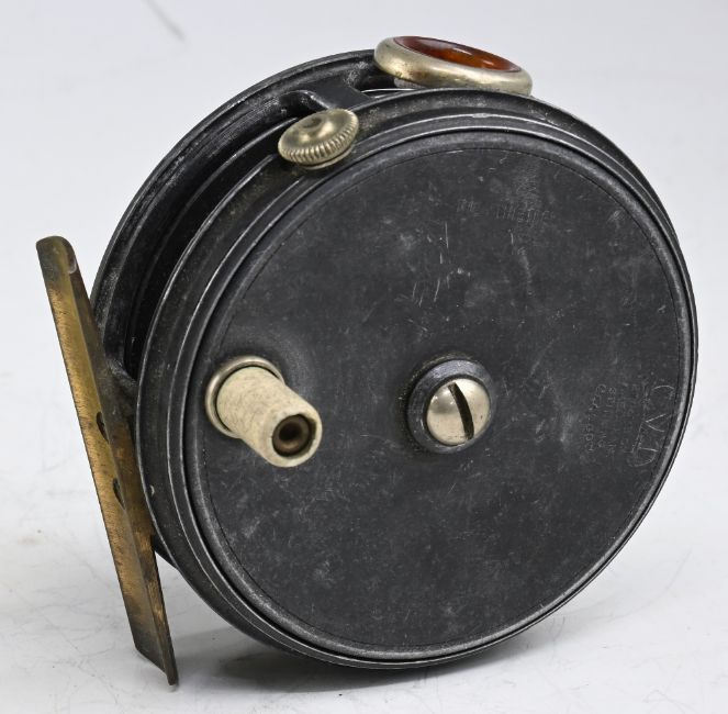 A scarce Alex Martin Glasgow Perfect style alloy trout fly reel, 3 3/8" ventilated spool, xylonite handle, milled rim tensioner, constant check, red agate line guide, smooth brass foot. Good finish for age, runs very well
