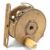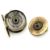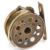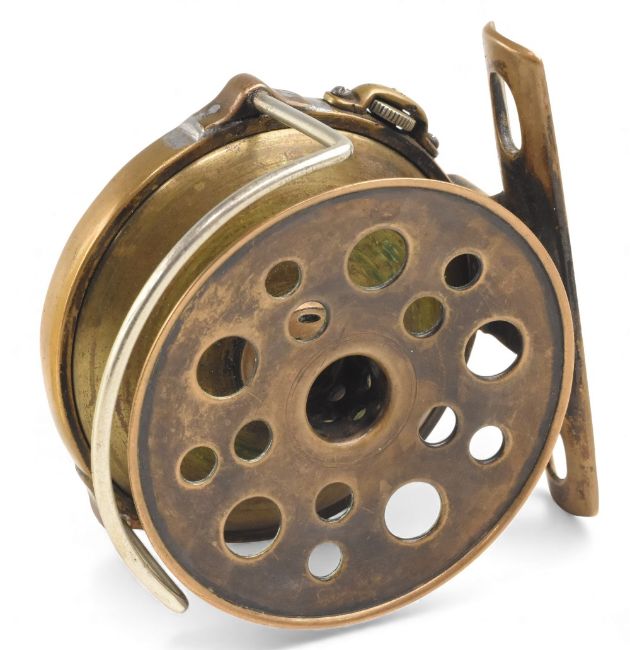 Extremely rare Hardy Perfect 2 7/8" all brass trout fly reel dished faceplate with large/small perforations, central hole, 85mm slotted/drilled brass foot, the block stamped "103", strapped tension regulator, nickel line guide, faceplate stamped with Rod in Hand trademark, original white handle, central boss stamped "Hardy's Alnwick, Patent 18373-612", the plate very faintly scratched with previous owner's address, being Longtown, Carlisle, rarely seen first model reel, in good working condition.