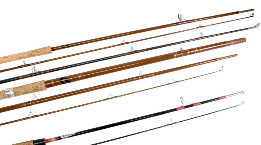 Steadfaste 14' 3 piece hollow glass match rod, cork handle, sliding reel rings, a Cel glass by Stammers of Stockport, 9'6", 2 piece hollow glass spinning rod, with sliding reel seat, an Olympic6' 2 piece boat fishing rod, detachable wooden handle, and a Winfield glass spinning rod, in cloth bag. (4)