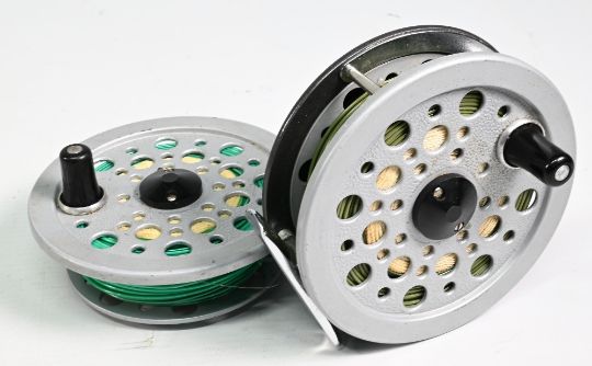 Shakespeare Beaulite 4 ¼" salmon fly reel and spare spool (2) with perforated face, constant check, quick release spool, smooth alloy foot, black handle - with light signs of use