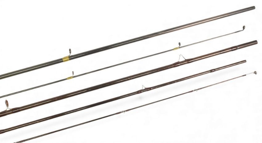 Century Eliminator Carbon Drift fly rod, 11ft 3pc line 5/6#, uplocking alloy reel set with wood insert, lined butt/tip ring, cloth bag, light use. Laser carbon trout/sea trout fly rod, 10ft 6" 2pc line 7/9#, down locking reel seat, lined rings throughout, cloth bag, light use. (2)