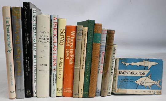 Fishing Books and publications to include Know Your Fish 1964 J.W Jones and P.H Tombleson, Fish out of Water 1990 Michael Craig, Fishing Fortunes and Misfortunes C1943 G.D Luard, Dressed to Kill c1987 Bob Carnhill and Kenneth Robson, A Biology of Crustacea 1967 J Green, In Praise of Trout 1989 David Profumo, Fly Dressing Innovations 1974 Richard Walker, New Angles on Coarse Fishing c1953 H.G.C Claypoole, Where to Fish 1984-1985 D.A Orton, Savay 1992 John Harry, A Particular Lunn One Hundred Glorious Years on the Test 1991 Mick Lunn, Profiles in Saltwater Angling 1973 George Reiger, Chalk Streams & Lazy Trout 1991 Robin Armstrong, Distant Waters 1997, Das Angler-Jahr 1978 Detlef Hensel, The Trout and the Fly A New Approach 1980 Brian Clarke and John Goddard (16) in generally good condition