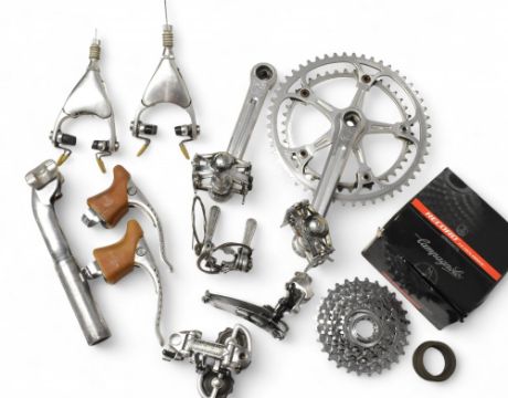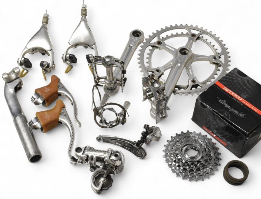 Campagnolo Collection to include Chain Wheel and Pedals, pair of Campagnolo Delta Brakes, Brake Levers, Seat Stem, Rear Record Derailleur, Front Gear Changer, Record Sprockets ideal lot to complete your frame