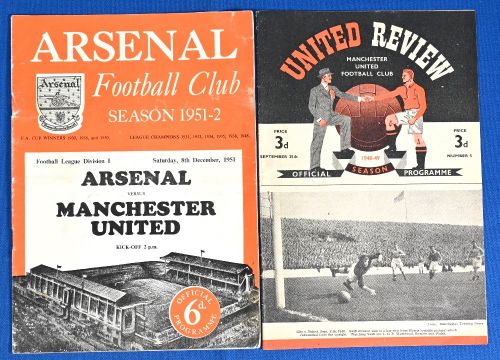 1948/49 Manchester United v Aston Villa Div. 1 match programme 25 September 1948; 1951/52 Arsenal v Manchester United (Champions) Div. 1 8 December 1951; home good, away rusty staple, team changes. (2)