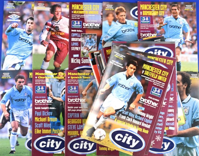 1993/94 Manchester City homes complete season (21) aways (7), FAC Leicester City, Coca Cola Cup Chelsea, Nottingham Forest, away Nottingham Forest; 1994/95 homes complete season (21), aways (6), FAC homes Aston Villa, Notts. County, away at Notts. County, Coca Cola Cup Newcastle Utd; friendly home v Feyenoord; 1995/96 season homes 19/21 aways (14) FAC home Coventry City, aways Leicester City, Manchester United Coventry City; 1996/97 complete league season homes 23/23 aways (13), FAC homes Middlesbrough, Watford, Lincoln City, Coca Cola Cup aways at Lincoln City; 1997/98 homes 19/23, aways (4), Coca Cola Cup homes Blackpool, away Blackpool, friendlies home Reggae Boyz (Jamaica), friendly away Kilmarnock, Burnley; 1998/99 City in Division 2 (the 3rd tier, for the 1st and only time) City homes 21/23, aways (5), FAC Darlington (H), Darlington (A), Worthington Cup Derby County (H), Notts. County (A), Notts. County (H); Div. 2 Play-off Wigan Athletic (home s/f), Div. 2 Play-off final at Wembley v Gillingham; fair/good. (1 box)
