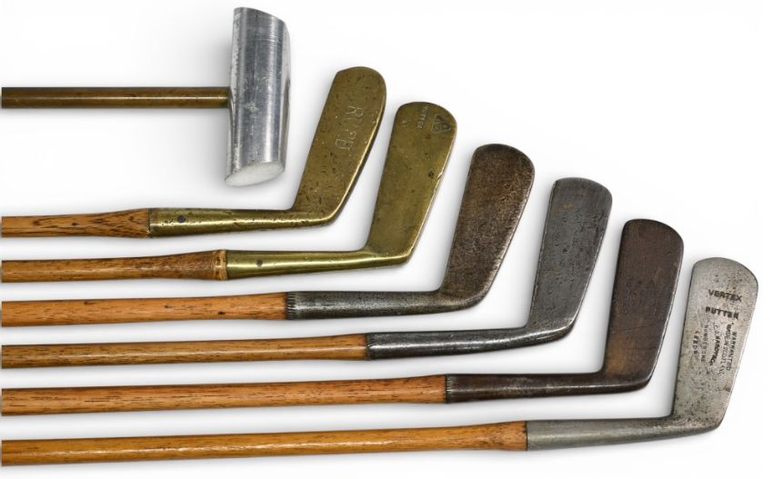 7x Assorted putters incl Gibson straight blade for W Button Redcar, 2x brass head putters, Vertex putter stamped C Hardyase of Leeds, plus a custom built 90 degree roller head 'Patent applied 30881' putter with metal shaft and split grip - all with grips