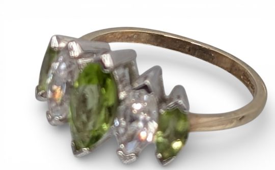9ct Hallmarked Gold Ring, light green peridot style garnet, with glass, size O UK, 3.4g with ring case