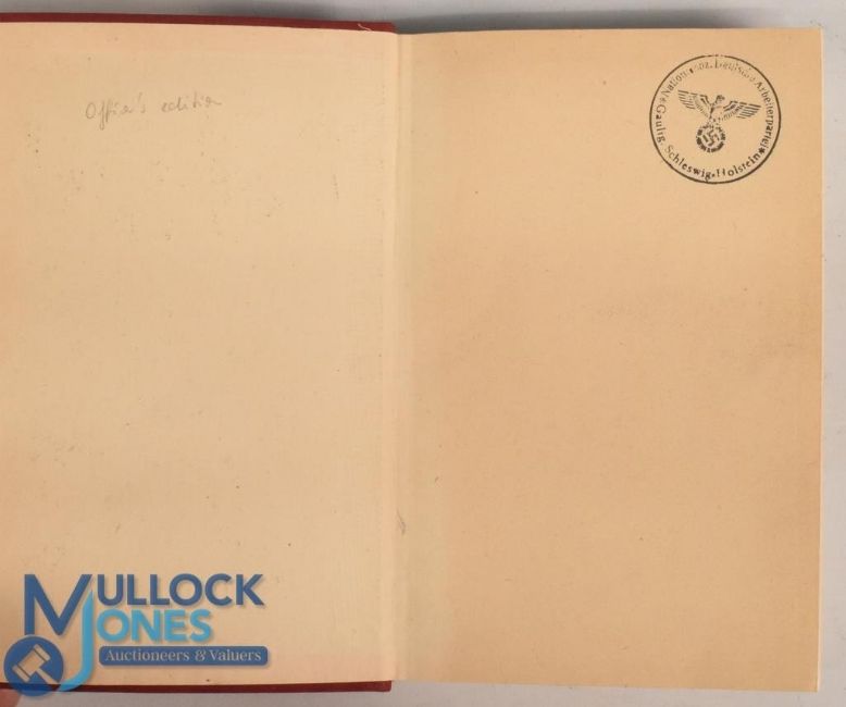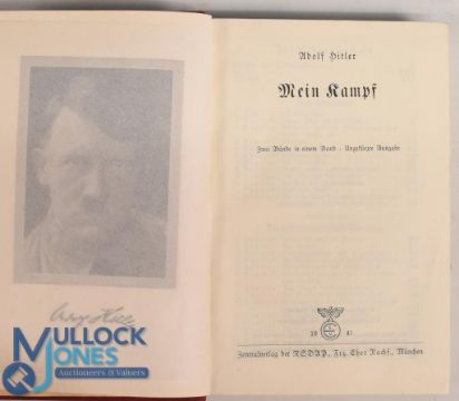 WW2 Mein Kampf by Adolf Hitler dated 1941: Officers edition covered in red Rexene with gold embossed title to front, having German eagle stamp to inside cover, 17 x 12cm