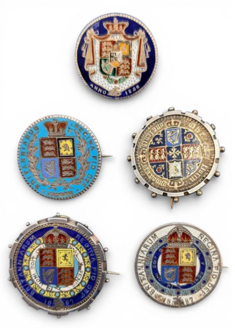 5x Enamelled Coins: with brooch fittings 1836 George IV florin, 4x Victoria 1887 florins, one gothic, two with white metal fittings