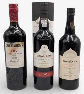 3x Bottles of Port: Cockburns LBV 2015 - W & J Graham’s 2005 late bottled, Malvedos 1996 vintage port, all with cellar wear