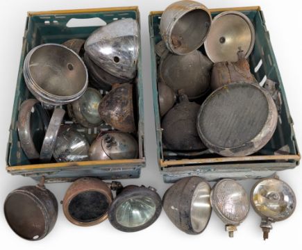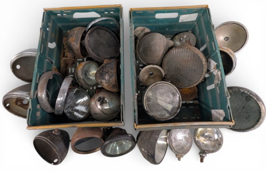 Automobilia 2x boxes of Period Car Light Lampo Fittings, chromed, brass, painted, parts, with names of Lucas, Raydot, all used parts for spares only
