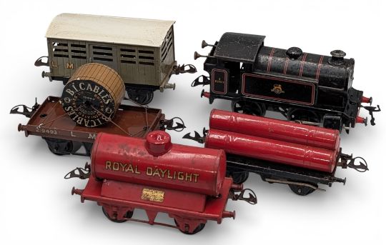 Hornby O gauge Clockwork Tinplate Tank Engine and rolling stock, a type 40 BR tank engine, Royal Daylight tanker, LMS flat wagon with cable drum, gas cylinder wagon, and a LMS cattle truck