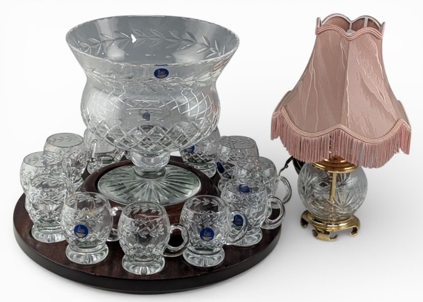 Abbey Collect Cut Crystal Punch Bowl and Tankards on Carousel Base, all complete with no damage, with a modern pressed glass-based lamp