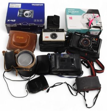 Mixed Camera Selection to include Olympus OM10, with Manual Adapter with Vivitar 28-85mm lens, Minolta Hi Matic F, Pentax Super Program with Vivitar 28-90mm lens, Panasonic Lumix S3 Digital in box, Olympus X-42 Digital in box, Flash Guns, Compact Cameras together with Kodak XL360 Movie camera (box)