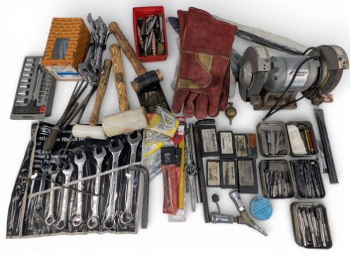Collection of Engineering Tools and Accessories: with noted items of Hilka 5” bench grinder, files, mallets, lathe tools, Roebuck taps, gloves, and more. Heavy item collection recommended