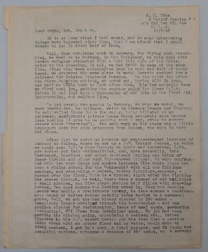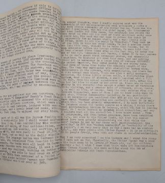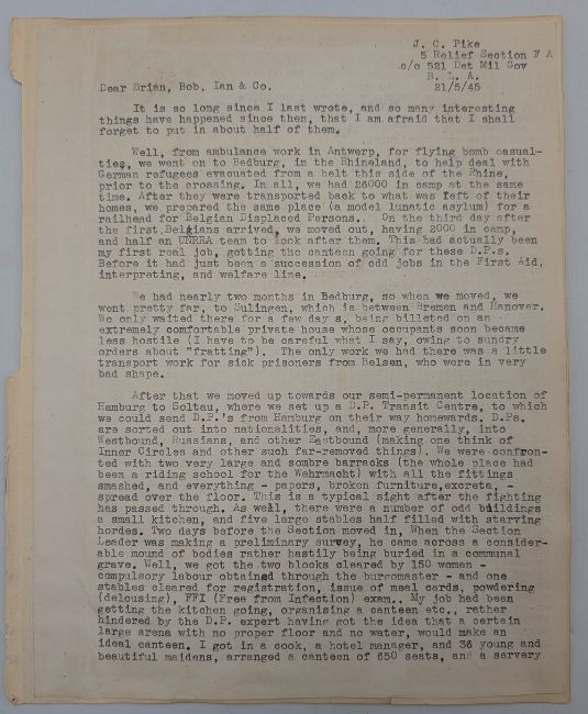 WWII The Holocaust, a remarkable firsthand account of Buchenwald Concentration Camp: an extensively typed letter by Christoper Pike 5 relief section FA May 21st, 1945, to friends in England, mentioning his humanitarian operations in the wake of liberation. Six pages with a draft patrol note - stuck down to old album page