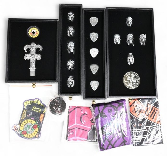 Guns and Roses Locked and Loaded limited edition Appetite for Destruction: to include 7 x 12" 180g Audiophile Vinyl LPs, including the original album, Live Like a Suicide EP, B-sides, and a 1986 Sound City session, 7 x 7" Singles, featuring tracks like "Shadow of Your Love" and "Move to the City" 4x CDs comprising 73 tracks, with 49 previously unreleased, including demos and live recordings, Blu-ray Audio Disc offering 5.1 surround sound mixes and original music videos. USB Stick: 32GB metal cross-shaped USB with high-resolution audio files. Memorabilia - handmade 3D cross, lithographs, replica ticket stubs, patches, buttons, metal skull rings, guitar picks, turntable mat, posters, and more. Comes in its original postage box
