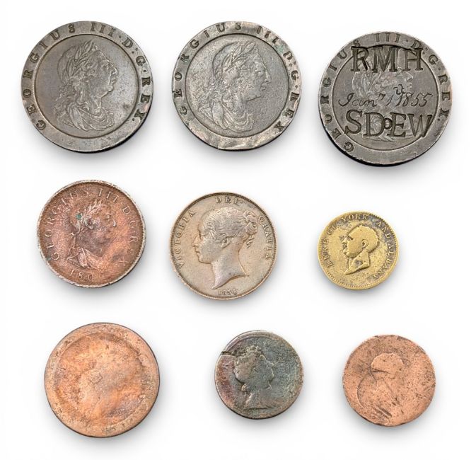 1797 Two Penny Cartwheel Coins and Tokens: 1827 death of Duke of York token, 3 large two penny coins, one over stamped RMH SDEW, a worn 1797 cartwheel penny, plus 1830, 1854 penny and worn examples