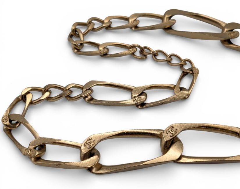 Vintage Chanel Ladies metal Fashion Belt, gold tone, gold plated with Chanel logo, adjustable size up to 34”