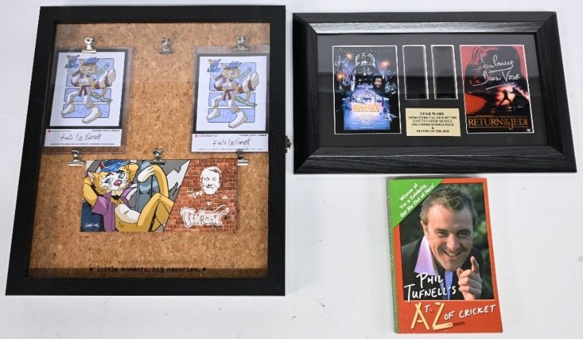 Star Wars signed Film Cell Display by David Prowse Darth Vader, limited edition 497/1000, together with Phil Tufnell's Tufcat cards signed by illustrator Kevin Lee Bennett, framed, A to Z of Cricket book
