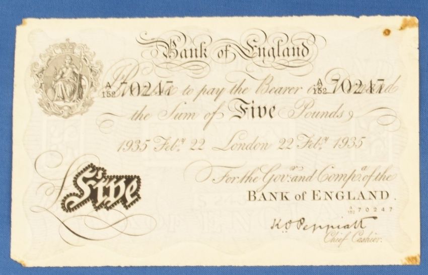 WWII German Operation Bernhard Counterfeit £5 Note: Operation Bernhard was an exercise by Nazi Germany to forge British bank notes. The initial plan was to drop the notes over Britain to bring about a collapse of the British economy during the Second World War. The first phase was run from early 1940 by the Sicherheitsdienst (SD) under the title Unternehmen Andreas (Operation Andreas). The unit successfully duplicated the rag paper used by the British, produced near-identical engraving blocks and deduced the algorithm used to create the alpha-numeric serial code on each note. The unit closed in early 1942 after its head, Alfred Naujocks, fell out of favour with his superior officer, Reinhard Heydrich