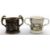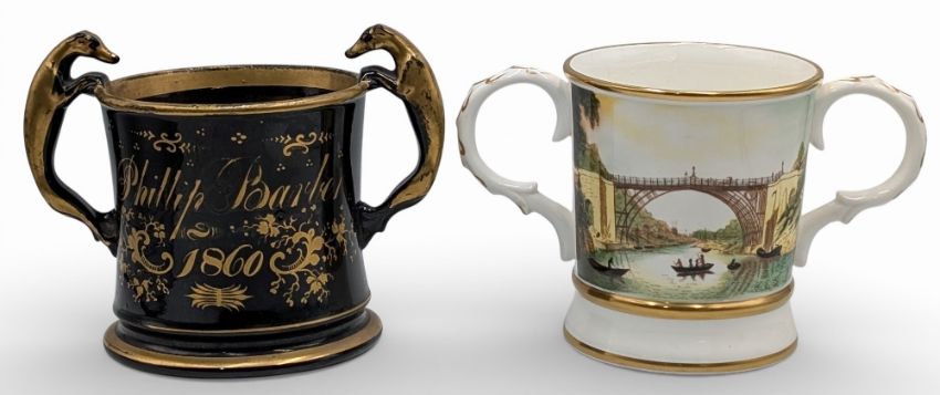 1860 Phillip Barber Jackfield type Loving Mug with all round gilt decoration and greyhound dog handles 15cm tall, with a 1979 Coalport Commemorative Ironbridge Trust limited edition mug 316/1979