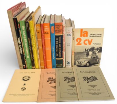 A collection of Motoring hardcover and paperback books and publications to include LA 2 CV 1977 Jacques Borge and Nicolas Viasnoff, Racing Mechanic 1957 Alf Francis, Directory of Historic Racing Cars 1987 Denis Jenkinson, Design and Behaviour of the Racing Car 1963 Stirling Moss and Laurence Pomeroy, Allard 1977 David Kinsella, The Chain-Drive Frazernash 1965 David Thirlby, The Austin Seven 1922-1939 R J Wyatt 1975, The Austin Seven 1968 R J Wyatt, Morgan Cars 1936-1960 Brooklands Books, MG 1929-1934 booklet, A Pictorial Survey of Racing Cars Between the years 1919 and 1939 T.A.S.O Mathieson 1963, Motor Racing Circuits of Europe 1958 Louis Klemantaski and Michael Frostick, The Racing Fifteen-Hundred 1984 David Venables, High Performance Cars 1954-55 Gregor Grant and John Bolster, World Rallying 1987 Martin Holmes, The Illustrated History of Road Transport 1986 David Burgess-Wise, three editions of the magazine of The Austin Seven 1971-1979 and The Original Minis Handbook (20) in generally VG-G condition with some small wear/tear