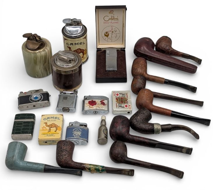 Smoking Pipes Lighter Collection: used mixed lot with a collection of Burr estate pipes, assorted lighters to include a silver edged Colibri. UK postage only