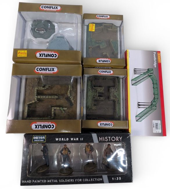 4x Resin Conflix Military Diorama Accessories: a set of 4 WW II history 1:35 metal figures and Hornby footbridge R076