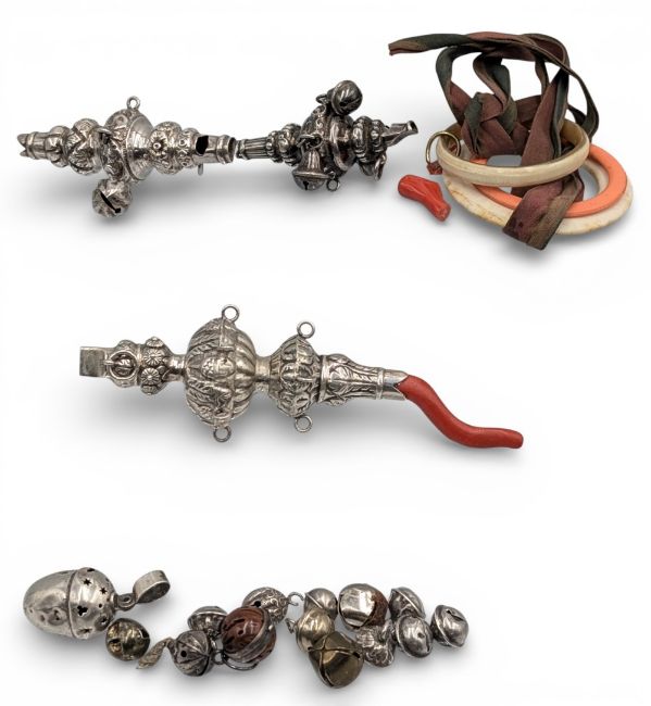 Antique Baby Teether, Rattle, Whistle, Bells parts for spares or repairs, some parts are filled