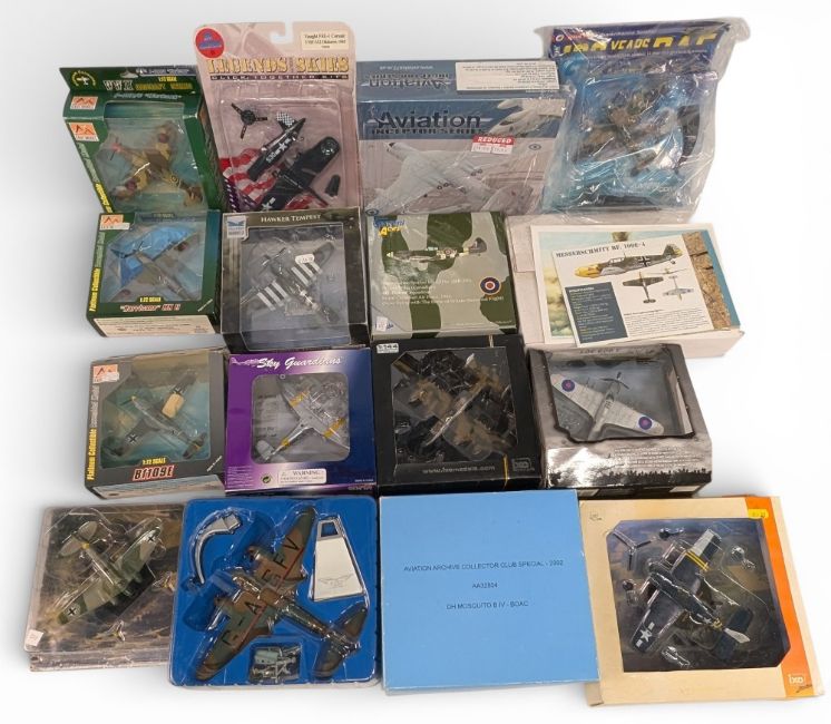 14x Assorted Diecast Areoplane Models: to include Aviation Vickers Valiant Ixo sky Gardians Hawker Seafury, Atlas twin pack Spitfire and Messerschmitt, Gemini Aces Spitfire, Forces of Valour, and more (14)