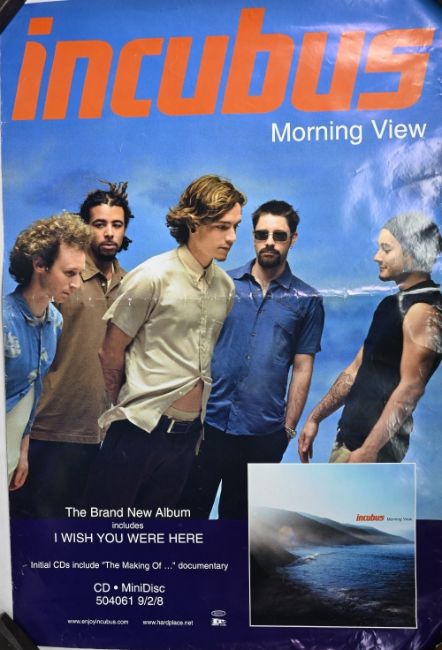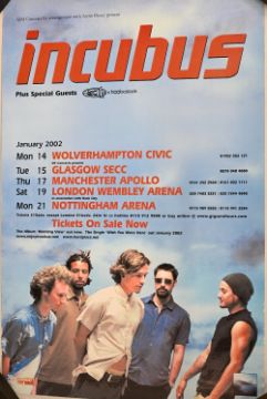 Incubus Concert Posters: 5 posters 2002 UK Tours Poster 46 x 70cm, Morning View New LP Release Poster 76 x 50cm, together with 3 Band posters 88 x 65cm - 86 x 60cm - 88 x 64cm. Incubus is an American rock band from Calabasas, California. The band was formed in 1991 by vocalist Brandon Boyd, lead guitarist Mike Einziger, and drummer José Pasillas while enrolled in Calabasas High School and later expanded to include bassist Alex "Dirk Lance" Katunich, and Gavin "DJ Lyfe" Koppel; the latter two were eventually replaced by bassist Ben Kenney and DJ Kilmore, respectively. Nicole Row replaced Kenney in 2024