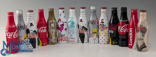 Coke Cola Collectors metal limited edition bottles: all aluminium bottles, 11 unused Coke Cola, Diet Coke and Zero Coke to include Marc Jacobs - 3 bottles empty